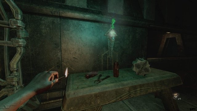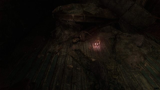 グールが貯水池の壁の穴に這うのを見た後、階段を降ります。暗い廊下を左に進み、別の壊れた階段を横切ります。予備のマッチとオイルを備えたスペアパーツ保管庫のように見える照明のないエリアに入ります。部屋の反対側、天井から差し込む太陽の光に照らされた最初のメモリ カプセルは、暗い場所にあるチェストの中に隠されています。