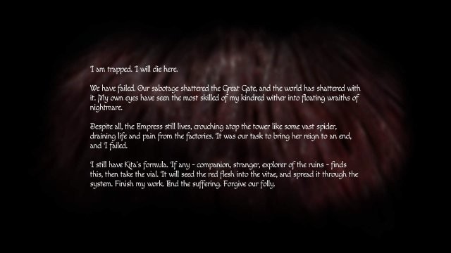 2つ目の記憶は、2回目の「異世界」訪問時に発見されます。サリムが「アリス・イン・ワンダーランド」からアリスを読み上げるローディング画面の後、女帝の隠れ家が目の前にあります。シリンダーは、彼女のベッド、バイタ インジェクター、動力のないドアを開けるために必要な三角形の動力伝達装置と同じ部屋にあり、彼女の机の上のメモの隣に立っています。