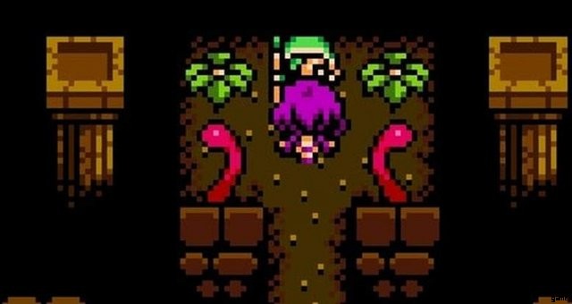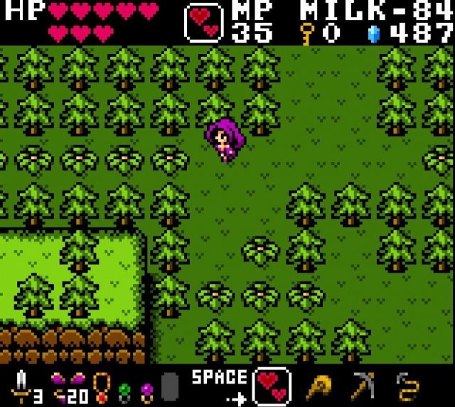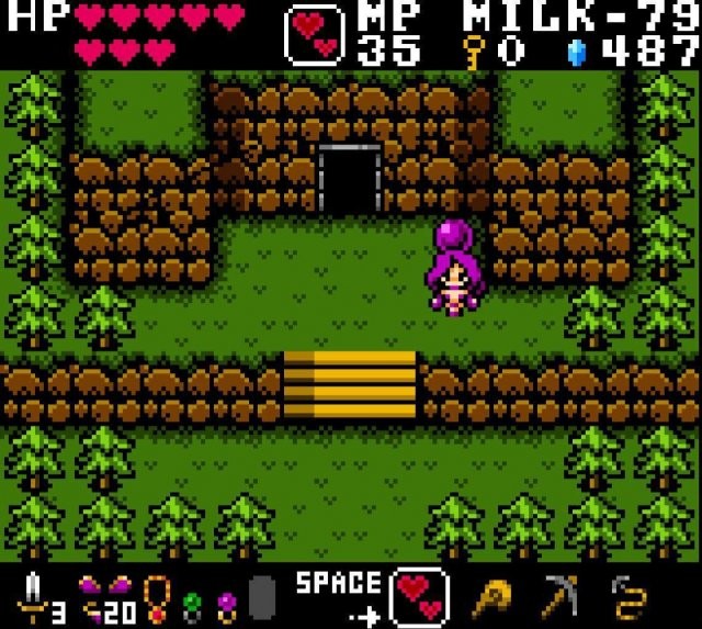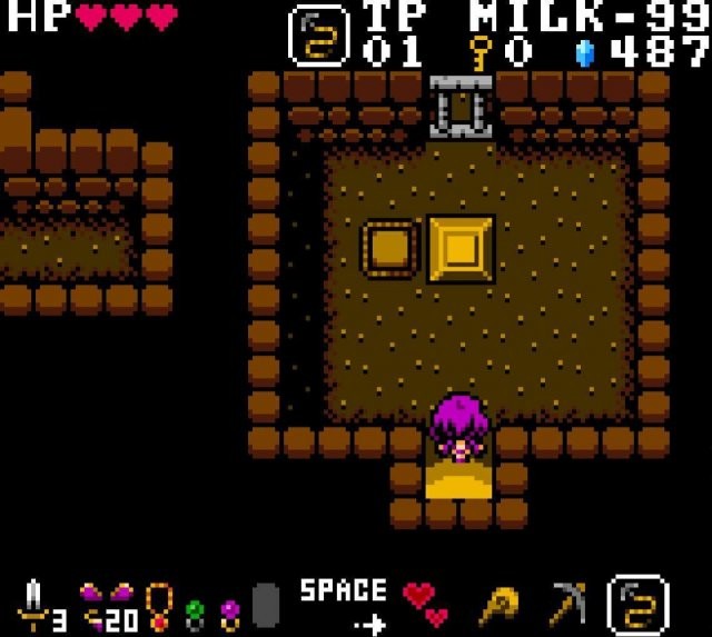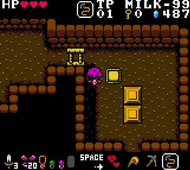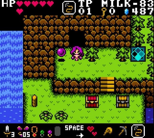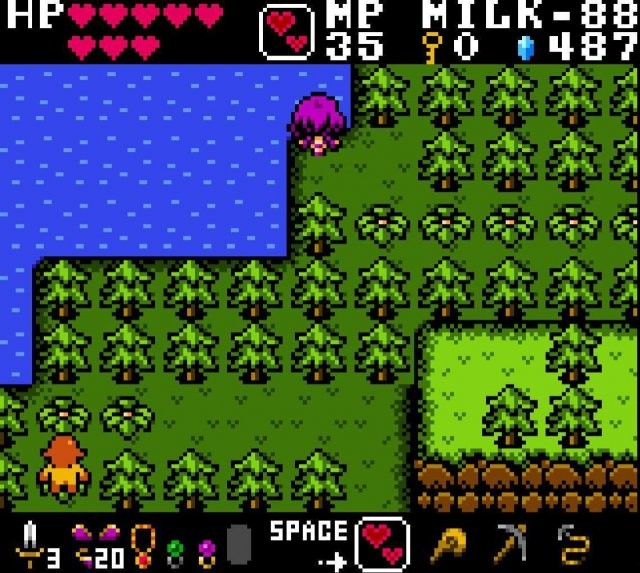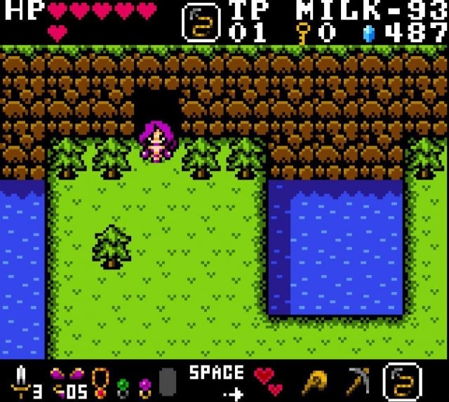 これがデバッグルームのミートアンドポテトです。テレポーター オーブは不活性で、おそらくオーブのスプライト テストであり、脱出には使用できませんが、洞窟のすぐ右にあるテレポーター パッドはサキュバスの家に戻り、ポットの北にあるテレポーターはアッセンに戻ります。 .洞窟に戻ると、代わりにデバッグ ルームの次のエリアに移動しますが、それについては後で詳しく説明します。チェストには適度な金額が含まれており、鍵を持っていない場合は、エリアの奥に鍵があります。また、つるはし、つる、草、壊れやすい岩、壊れない岩、SPピックアップ、フックポストが散らばっています。ここには敵はいません。左側の滝を過ぎると、デバッグ ルームの後半につながる別の洞窟があります。