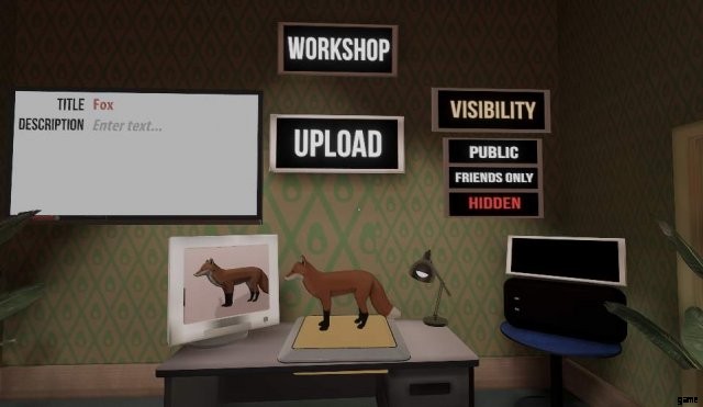 オブジェクトを右側の部屋に持っていき、黄色い台の上に置きます。ここで、オブジェクトに名前と説明を付け、その可視性を設定できます。 [アップロード] ボタンをクリックすると、アイテムがワークショップで利用できるようになります!可視性、タイトル、および説明は、後で Steam クライアントまたは Web サイトからいつでも変更できることに注意してください。