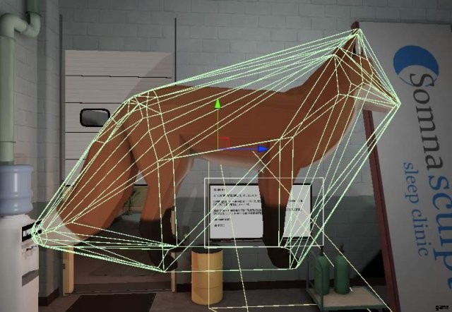 複雑で不規則な形状のオブジェクトがある場合、デフォルトのコリジョン メッシュ (凸型メッシュ) はオブジェクトのギャップをカバーしますが、これは希望どおりではない可能性があります。たとえば、犬の足の間の領域はコリジョン メッシュに含まれているため、銃身の上に配置することはできません。
