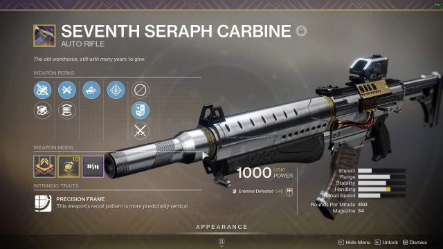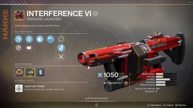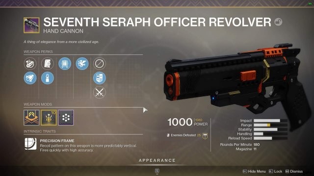 違いを生み出すためにこの武器に必要な特典は、Extended Mags、Fourth Time's A Charm、および High Impact Reserves です。これにより、11発のショット(すべてのクリティカルをヒットした場合)が可能になり、さらに多くのダメージを与えるBoss Spec modを装備できます.マスターワークは重要ではありませんが、リロード速度またはハンドリングのいずれかが必要です。