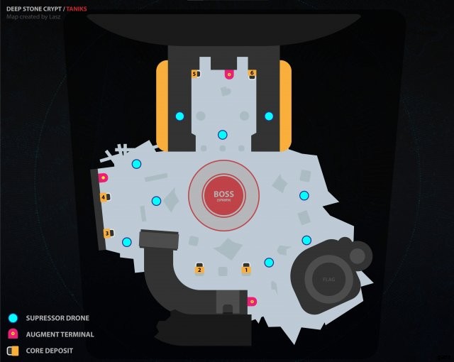 - スキャナーは、中央の 4 つのビンのうちどの 2 つが光っているかをチェックします。これらは、ランナーが核コアを預ける必要がある場所です。その間、オペレーターは左または右のコアステーションの横にあるキーパッドを撃ち、チームのために核コアを生成します.サプレッサーは 3 つのセキュリティ ドローンの 1 つの下に待機しており、そこからタニクを撃つことができます。