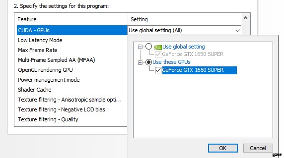 - その下にオプションのリストが表示されます。「CUDA-GPU」オプションが表示されるまで下にスクロールします。そのオプションを選択すると、下部にポップアップ メニューが表示されます。「これらを使用する」オプションを選択します。 GPU's」をクリックし、ここに示すようにそのすぐ下にある GPU を選択します: