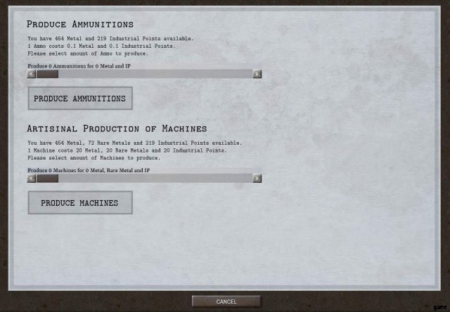 - 軍需品 – 軍隊を撃ち続けるために必要な材料。弾薬が尽きると、部隊は戦うことができなくなります。それらは生産することができます。詳細は後述します。