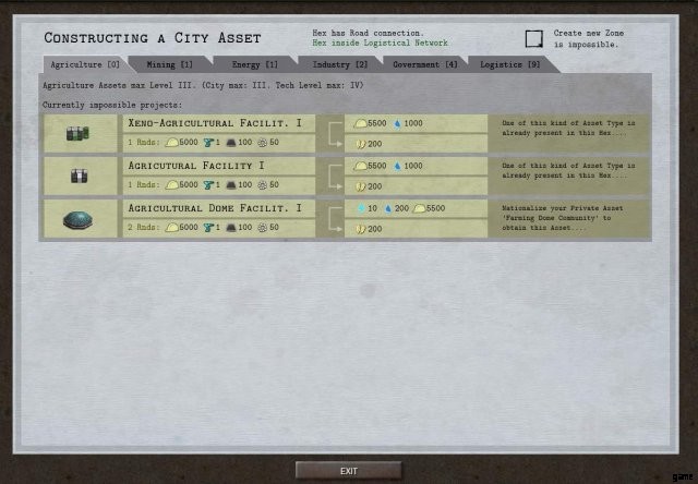 すべての建物にはターンごとのコストと建設時間があることに注意してください。農業ドーム施設 1 の参照コストは、5000 人の労働者、1 台の機械、100 の金属、50 の工業生産高です。これは比較的安価で、ほとんどの場合ゲーム開始時に構築できます。