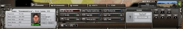 ここがエコーマウンテンです。現在選択されているヘクスを制御するためのさまざまなタブがありますが、ここでは都市ヘクスに焦点を当てます。ゾーン情報は、首都だけでなく、ゾーン内の任意のヘクスで見ることができます。そこにはいくつかの値が表示されますが、最も注目すべき値は都市のサイズの値を下回っています。