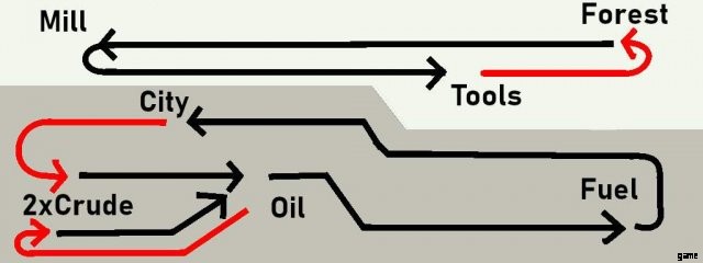 効率的な「木材」の供給ラインを説明するために、このゲーム内の例を見てください。「支払い中の荷物」は緑で、「空の荷物」は赤で示されています。複線 (コスト効率の高い) 回線を 1 つだけ使用しています: