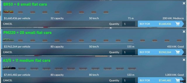 私がアップグレードしようとしていたのは、木材> 厚板> 工具のサプライ チェーンで、6 つの列車で運営されており、4 つの列車は耐用年数を過ぎています。各列車は BR53 と 8 つの小さな平たい車で構成されています。したがって、1918 年には 3 つの交換オプションがありました。