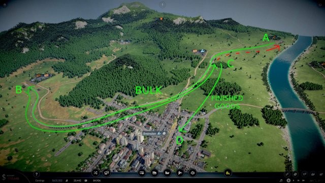 ここでは、工具工場は街の真ん中にあり、都市からそれほど離れていません。最初に、完全にロードされた A>B バルクウッドを反対側まで走らせます。次に、厚板で戻りますが、最後の C>A ビットだけに負荷がかかりません。熱心な観察者にとって、都市へのツールは空のワゴンで戻ってきますが、それはほんの数ワゴンであり、利益をそれほど損なうことはありません.