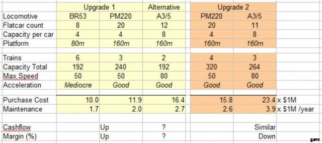 A3/5 の 80km/h へのジャンプはそれほど目を見張るものではありませんでした。別の場所に新しいラインを開設し、PM220 をさらに 10 年間運用することに資金を費やしたほうがよいでしょう。総キャッシュフローはわずかに改善されましたが、2,340 万ドルを費やした割にはリターンが低いです。