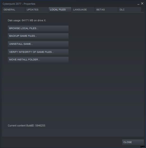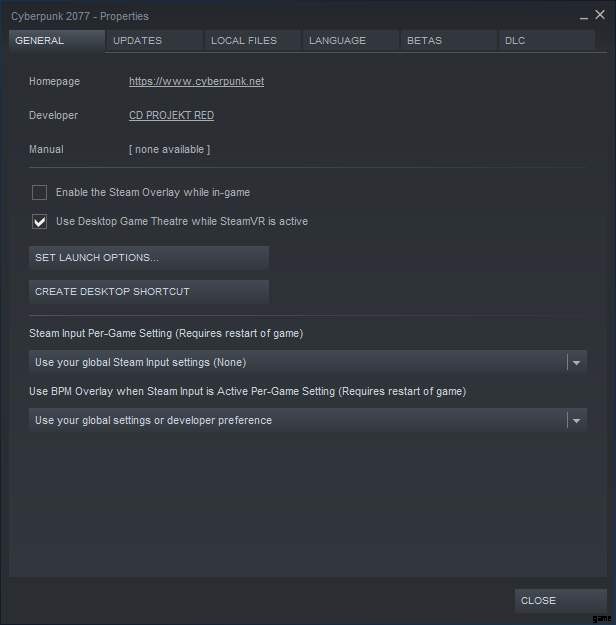 - Steam を使用している場合は、サイバーパンク ゲームを右クリックしてプロパティに移動すると、このウィンドウが開きます。