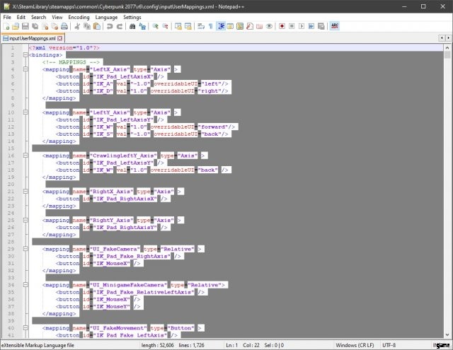 #6. お気に入りのテキスト エディターで inputUserMappings.xml ファイルを開きます。私は Notepad++ を使用しているので、作業が少し楽になります。
