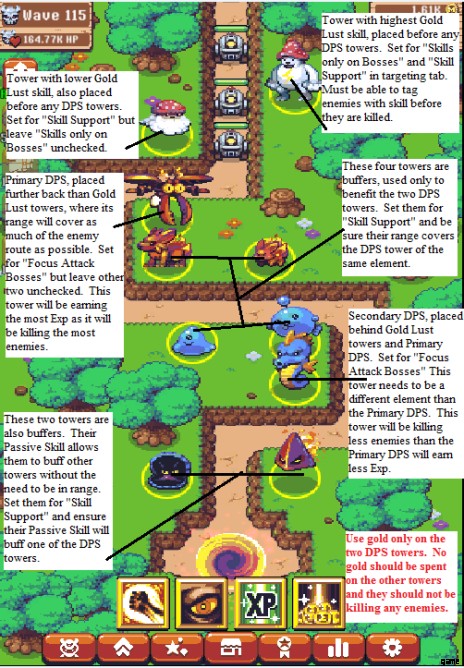 ほとんどの場合、アイドル モンスター TD をプレイする最良の方法は、2 体のモンスター (2 つの異なる要素) を選択して DPS モンスターにすることです。残りの 8 体はサポート (1 ~ 2 体のゴールド ラストのフラッフィー バリアントを含む) になります。地図)。これには主に 2 つの理由があります。まず、得られる経験値はこの 2 つだけに集中します。次に、ほとんどの波を乗り越えるために使用できる最小量は 2 つであり、2 つだけにすることで、可能な限り高いレベルに到達するために必要なゴールドの量を減らすことができます。 3つまたは4つを使用すると、最終的にそれらの最大レベルが低くなり、ダメージが少なくなります. 2 モンスターのセットアップが負担になるのは、ウェーブ 500 をヒットした後だけです (ただし、通常は 750 前後までではありません)。この時点で、ロボットは同時に 2 つのエレメンタル シールドを持つことができます。これは、DPS モンスターが攻撃するのと同じシールドを持つ可能性があることを意味します。これは落胆しますが、それでも続行できます。ウェーブに失敗すると、-1 で終わる最後のウェーブに戻るだけなので、最大で 9 ウェーブ返され、再試行します。手動でプレイしている場合、これは呪文を使用する機会があることも意味します。レイン オブ ファイア (ROF) は、シールドを持ったモンスターを全滅させるのに最適です。ウェーブ 500 に到達すると、EMP を購入する機能もアンロックされます。これにより、ロボットのシールドが一時的に取り除かれるため、ロボットをすばやく倒すことができます。