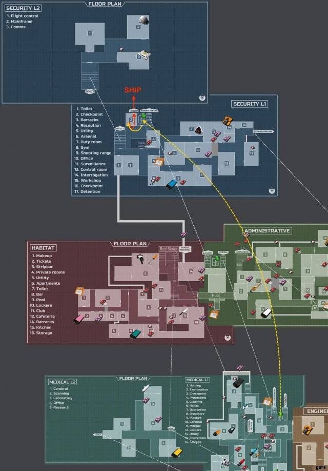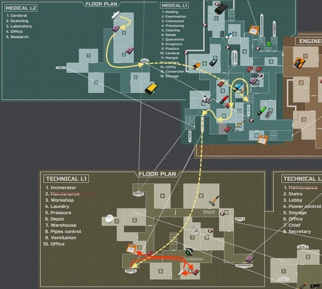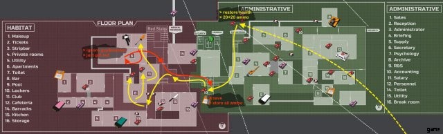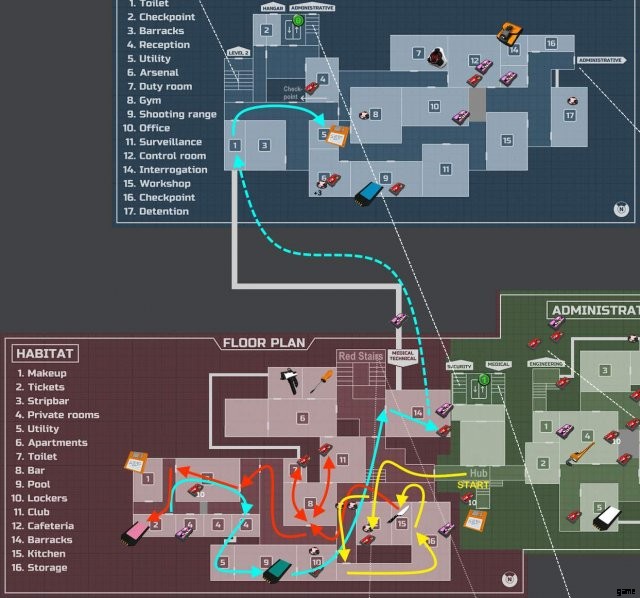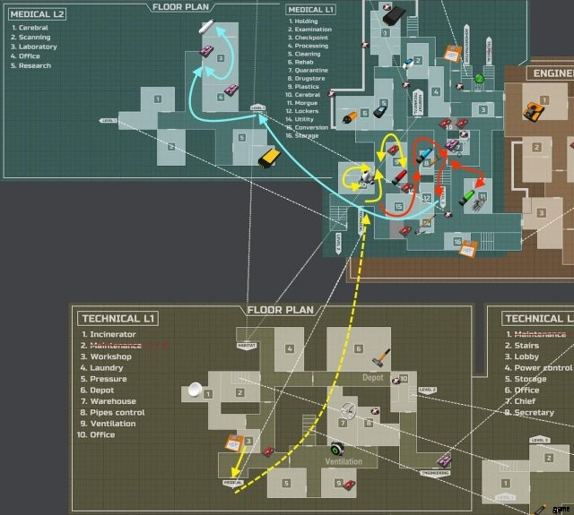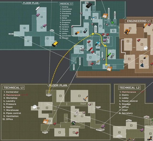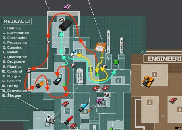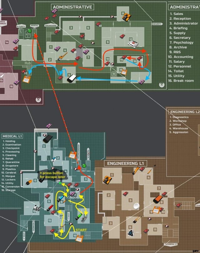 理由: ティール キーカード (後で医療への扉を開く) を取得するには、鉗子 (siccors のように見える) とホワイト キーの両方が必要です。途中でバールを見逃すことはありません (次のホワイト キーとセキュリティまでに必要です)。