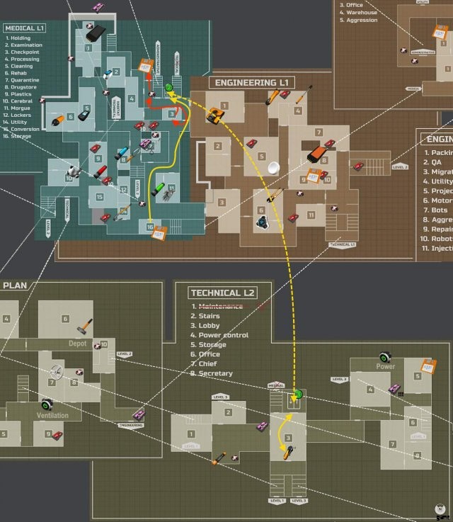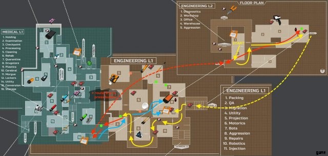 理由: 3 つのフラスコ (赤、青、緑) をすべてつかみ、医療 L2 をクリアする白いエージェントを作成します (黄色のキーに到達するために必要です)。