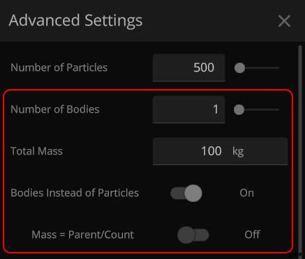 詳細設定にアクセスする方法がわからない場合は、リング プリセットにカーソルを合わせて、小さな鉛筆アイコンをクリックします。良い?良い。次に、最初のセクションで、体の数を 1、総質量を 100 kg に設定し、粒子の代わりに体をオンにし、質量 =親/数が無効になっている場合は無効にします。