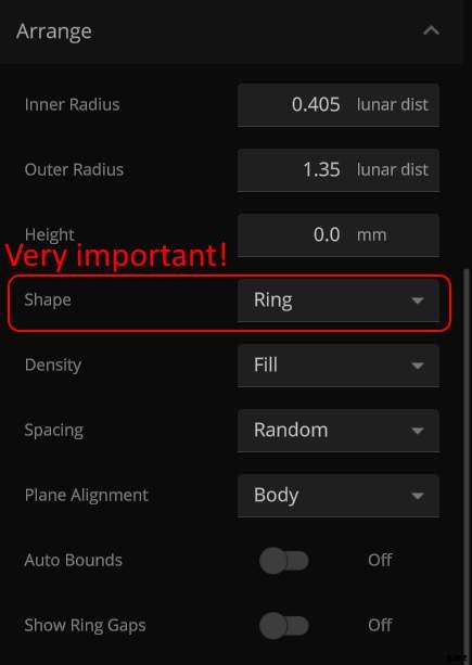 次に、最も重要な部分について説明します。アレンジの下で、シェイプがリングに設定されていることを確認してください。これが既にあるプリセットを選択した場合は、それで問題ありません。ただし、Moon Swarm のようなものを選択した場合は、必ず Shape を変更してください。これは適切に整列するためであり、ランダムなものではありません。