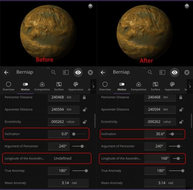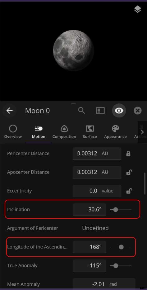 次に、Moon 0 を選択し、モーション タブに移動します。昇交点の傾斜角と経度が表示されるまで、軌道要素まで下にスクロールします。この 2 つの数字をメモ帳などにコピーし、どちらがどちらであるかを書き留めます。ここには他に重要なものは何もないので、ここで Moon 0 オブジェクトを削除できます。