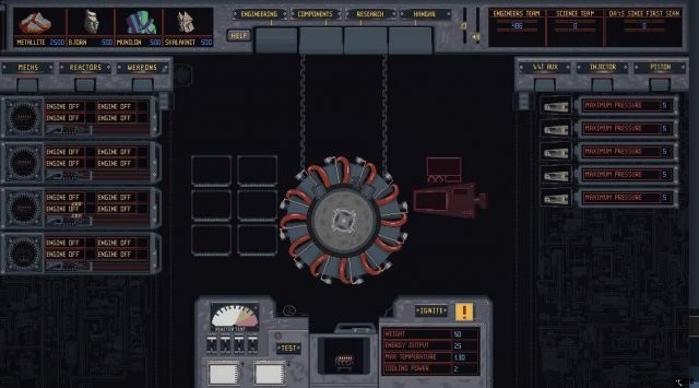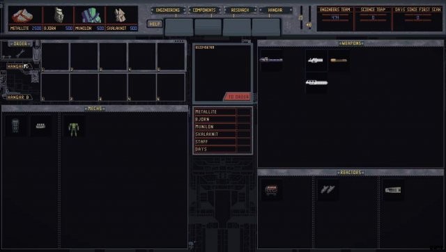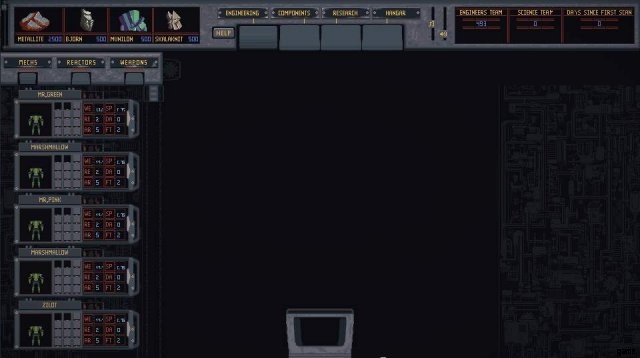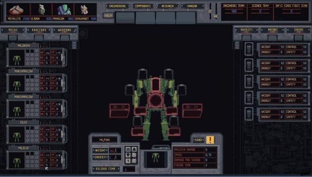 ここでは、メカとそのすべてのパーツが表示されます。両側に表示されるさまざまなコンポーネントをドラッグしてスライドする必要があります。メカリストからクリックしても、スロットからメカが削除されることはなく、実際にはリアクターと武器を追加する方法です.各パーツの配置には、右上に示されているエンジニアの労力が必要です。翌日に行くとこれが修正されます。あなたの機械にはいくつかの要因があります。