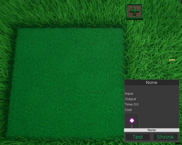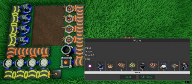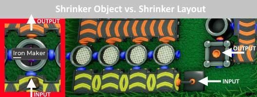 ゲーム内のマニュアル (デフォルトのキーバインド:'b') は、Shrinker を説明するのに優れた仕事をしていますが、(現在) 画像なしで説明しているため、私のような視覚的/実践的な学習者にとって想像するのは困難です.一般的な考え方は次のとおりです。Shrinker プロットを使用すると、Puller を入力として使用し、Collector を出力として使用して、設計のアセンブリ ラインを構築できます。次に、この組み立てラインは単一のタイル オブジェクトに凝縮されて庭に配置されます。そこで「入力」リソースを供給し、「出力」リソースを受け取ります。