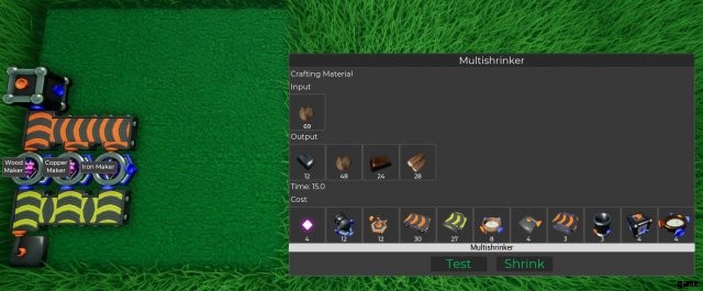 明らかではないかもしれませんが、適切なセットアップができたら、シュリンカーをシュリンカーの中に入れることができます。これにより、リソースの獲得量がさらに増加します!これは、入力として単一の基本マテリアル (土) を使用するという以前の推奨事項に戻ります。これにより、この種のセットアップが非常に簡単にコンパイルできるようになるからです。