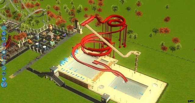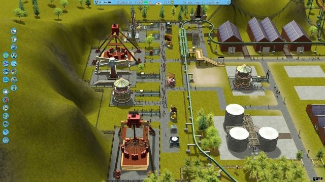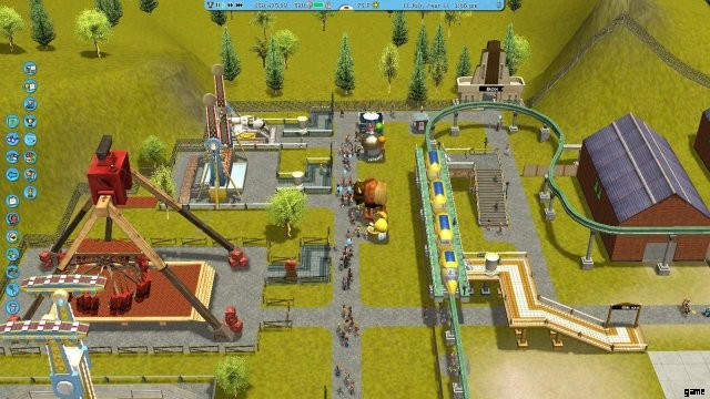 十分なお金が貯まったら、公園の左側に乗り物を追加します。 Double Swing Inverter、Rotor、および別の TNT Vortex を選択しました。価格を上げ、音楽を設定し、メイン パスに接続します。テスト モード (黄色のフラグ) を 1 分間実行してから、緑色のモードにします。