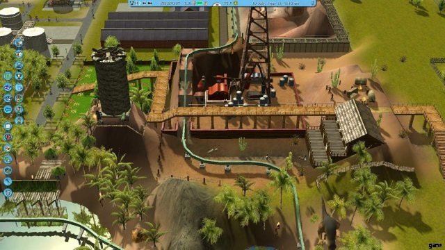 待っている間に、シナリオに付属する 3 つのレストランを削除します。それらは、アニマトロニクス油井の下、画面の下部を過ぎて公園を下る隆起した黄色の小道の下にあります。レストランをクリックし、詳細アイコンをクリックして、ゴミ箱をクリックします。あなたはそれらを実行するためにお金を払っていますが、彼らはお金を失っています.また、そこに降りるために追加されたパスの一部であるステップも削除しました。そのメインの左から右への道はそのままにしておきます。のぞき見は、公園の右側でそれを乗り越えることができる必要があります.