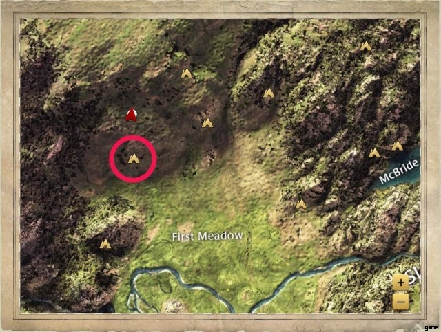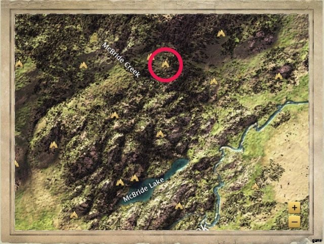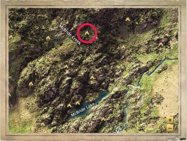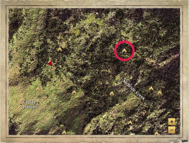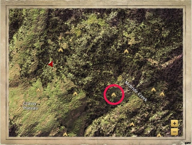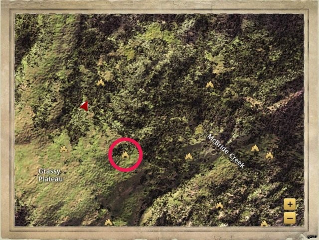 It’s in a clearing to the east of McBride Creek’s label on the map. There’s a boulder just to the west of it, and a trio of three trees to the east.