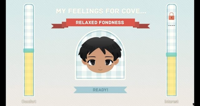 ステップを開始する前に、下の画面に移動して、バーを押したまま動かして、快適さと興味のレベルを選択できます。心地よさは、ナーバス、リラックス、ダイレクトです。興味は、無関心、愛情、ときめき、愛です。