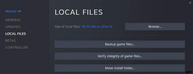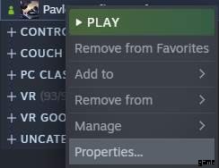 Steam ライブラリで Pavlov VR を右クリックし、[プロパティ] をクリックします。