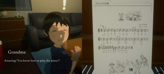 ピアノの横の引き出しにある楽譜を弾くと、おばあさんとちょっとした会話ができます。もう 1 つのすばらしい事実は、楽譜に仮面ライダーとウルトラマンの両方の落書きが含まれていることです。