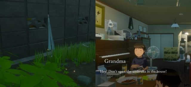 家の中に傘を持って行き、おばあさんの近くに持っていくと、家の中で傘を開けないように言われます。ただし、中の傘を使い続けても何も起こりません。
