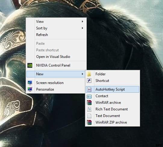 デスクトップの任意の場所でマウスを右クリックし、[新規]> [AutoHotKey スクリプト] に移動します