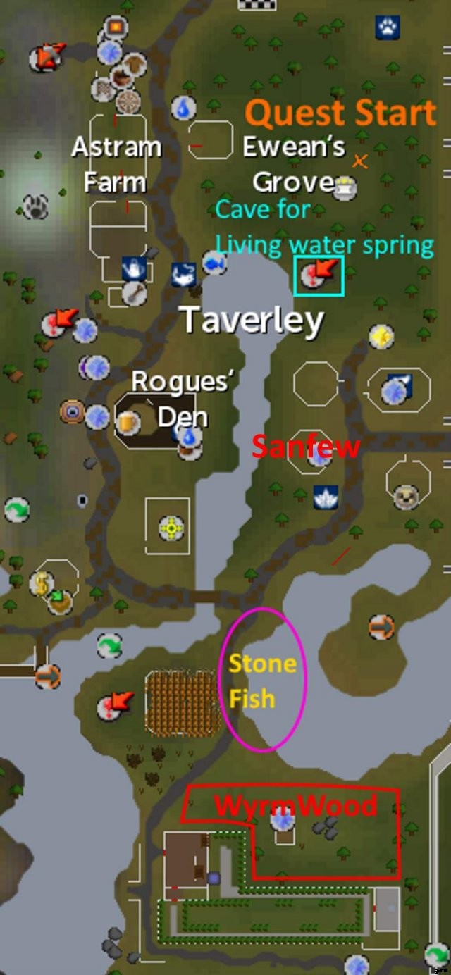 彼は、トロールとの戦争で Guthix の好意を得るために式典を行うためにポーションを醸造する必要があることを教えてくれます。クエストを開始するという彼の要求を受け入れると、タバリー (ストーン サークルの南) にいるサンフューと話す必要があることを伝えられます。