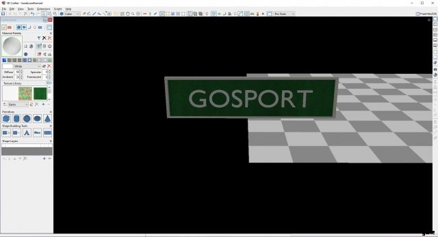 この例では、看板用の長方形のボックスを描画し、約 3 メートル x 1 メートル x 10 cm の寸法でサイズを変更し、テクスチャ (緑色の標識の 256 x 256 .bmp 画像) を適用して、ゴスポートの駅標識を作成しました。白い境界線で)、その上に白いテキストを追加して、「Gosport」という単語を綴ります。また、テキストにはテクスチャを適用する必要がありました (白い背景の 256 x 256 .bmp 画像)。テクスチャを適用する方法を説明する 3D Crafter のチュートリアルがあります。