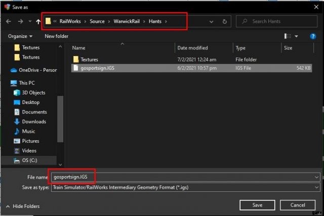 このウィンドウが表示され、新しい .igs ファイルを保存する場所を尋ねられます。このためには、Railworks Source フォルダー内の Developer フォルダーにある Product フォルダーを選択する必要があります。ファイルを gosportssign.igs とします
