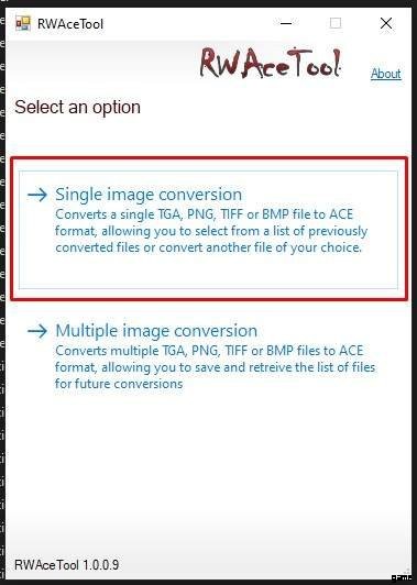 RWAceTool.exe ファイルをクリックして起動します。次に、単一の画像オプションを選択します (1 つずつ実行できるように、2 つのファイルのみを変換します)。