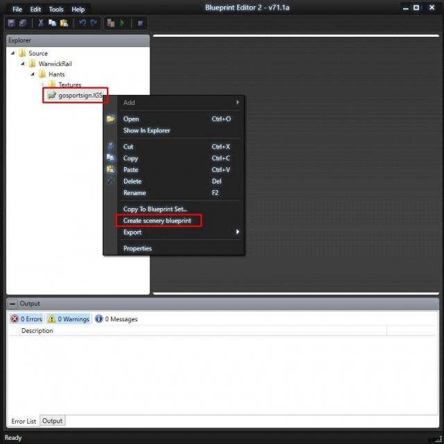 これをダブルクリックするとブループリント ウィンドウが表示され、そのメニューをナビゲートして、オブジェクトの .igs ファイルがある開発者フォルダーを開きます。ファイルを右クリックすると、ウィンドウがポップアップ表示され、[シーナリー ブループリントの作成] を選択できます。