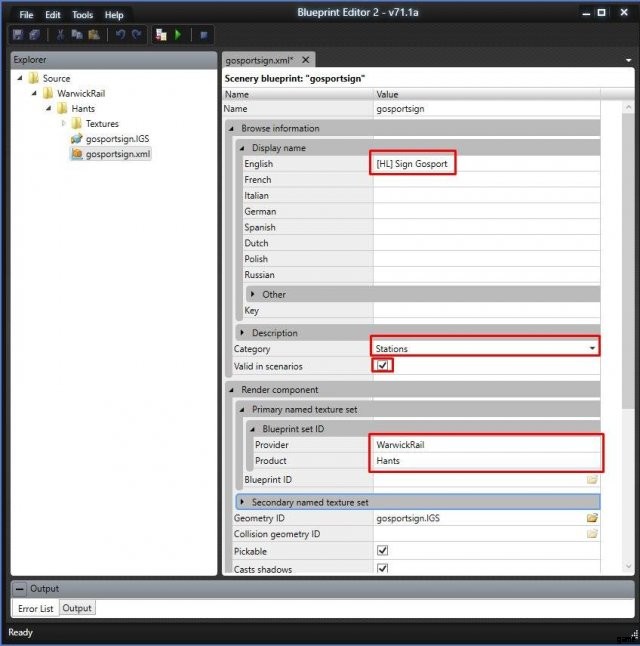 エディターでステーション リストを見ると、オブジェクト [HL] Sign Gosport がそこにあり、選択できます。