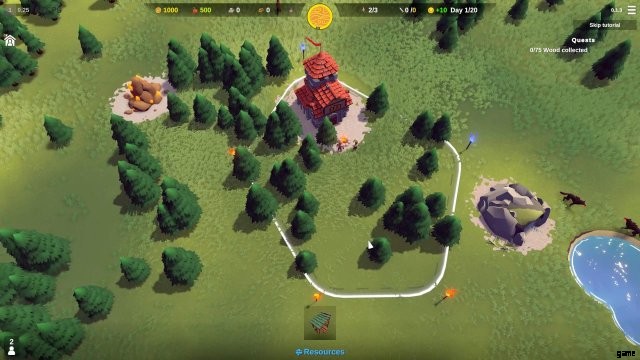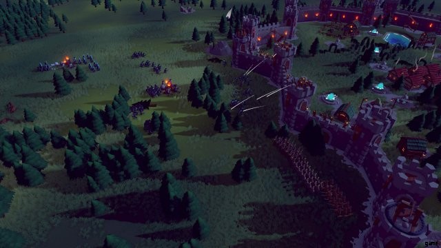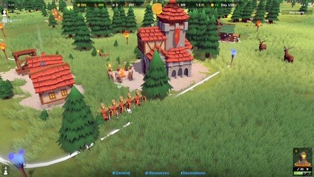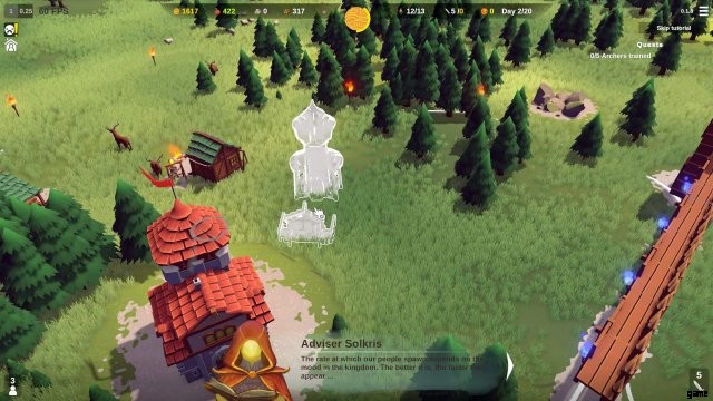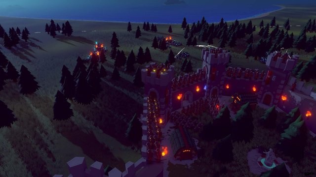画面の上部には、夜までのカウントダウンと、暗くて巨大な敵が表示されます。ゲームは、剣と盾で武装した兵士の最初の駐屯地を提供します。また、王国の境界にある青い松明を照らすことで、敵が攻撃する方向も示します。