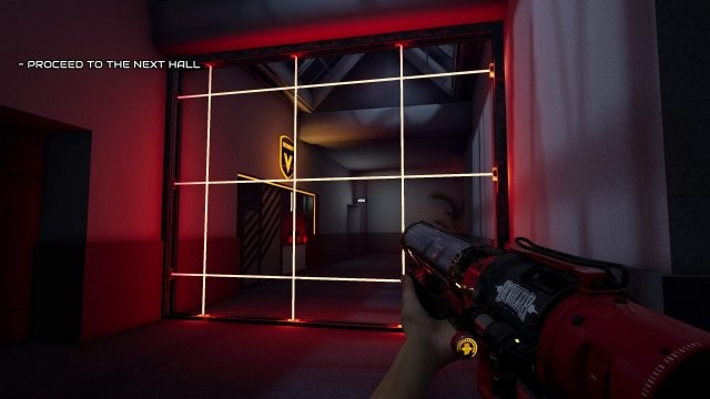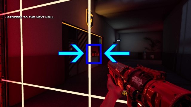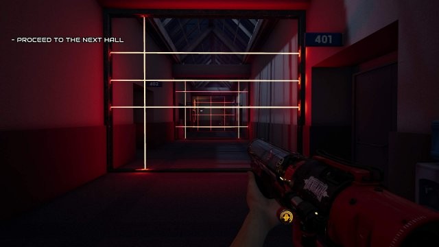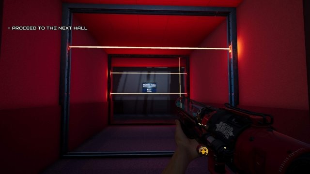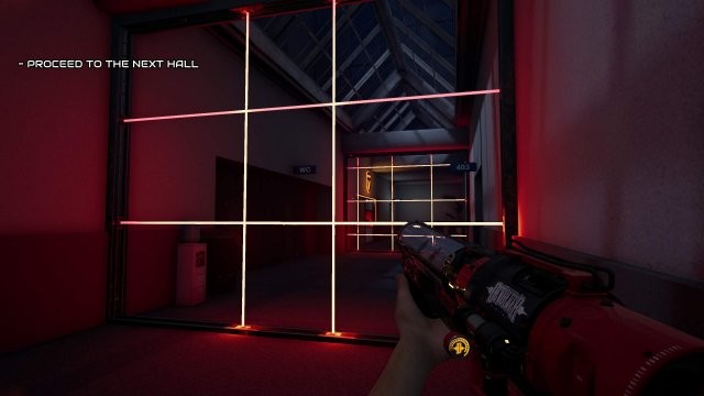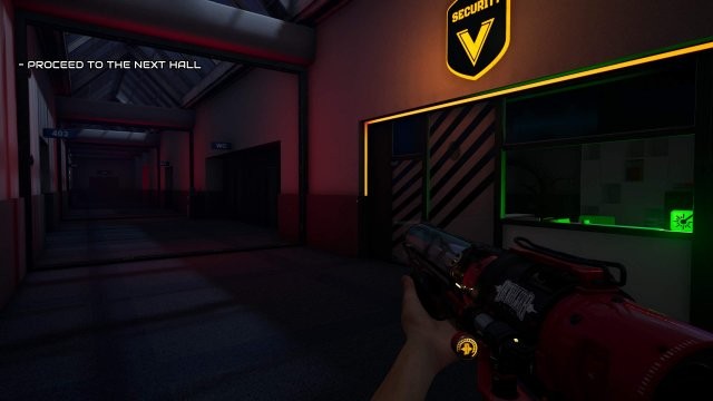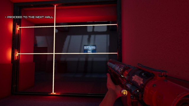 廊下の一番奥を見ると、赤いボックスが光るセキュリティブースが見えます。これは、セキュリティ オフィスで出席者バッジにアクセスする前に、ゲームの開始時に撃ったのと同じボックスです。