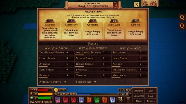 メディテーション スキルに 5 ポイントを投資してコンピテントになると、タレント ストーンのクールダウンが 25% 速くなります。 15 ポイントを投資してスペシャリストになると、クールダウンが 50% 速くなります。また、アスレチックス スキルに投資するとスタミナが増加します。