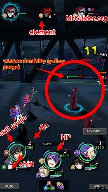 敵を攻撃するにはAP(アクションポイント)が必要です。バトル中の敵をタップすることでターゲットを変更できます。緑色のバーはキャラクターの HP を示します。 HPバーのすぐ上にスキルバー(青色)があり、敵を攻撃するとゲージが増えていきます。一定の時間が経過すると、アイコンを上にスライドしてキャラクターのスキルを発動できるようになります。
