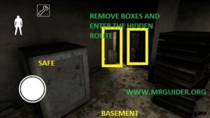 隠しルートはどこ?地下室の金庫の近くに、いくつかの木箱があります。それらを移動します(右側に移動し、左側に移動します)。隠し部屋に入る。しゃがみ姿勢に変わり、まっすぐ進みます。