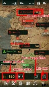ワールド マップに移動すると、利用可能なすべてのミッションにアクセスできます。場所をタップすると、次の画面で必要な弾薬、在庫の弾薬、リスト、弾薬箱の数を確認できます。