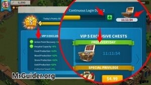 同じ画面 (VIP メニュー) で、VIP チェスト (VIP レベルに基づく) を請求できます。このチェストは毎日入手できます。食料、木材、スピードアップなどのアイテムがたくさん含まれています。そして、無料の VIP ポイントを請求することを忘れないでください。 VIPレベルを上げるにはVIPポイントが必要です。上記のヒントでは、宝石を使って VIP ポイントを取得する (VIP レベルを上げる) ことを説明しました。デフォルトでは、Rise Of Kingdoms ゲームは毎日無料の VIP コインをプレゼントします。そして最高の部分は、継続的にログインするか、毎日この宝箱を集めると、ゲームは翌日より多くのポイントをプレゼントすることです.例えば;初めて 20 VIP ポイントを獲得できます。翌日には 20 を超えます (ただし、継続的にログインする必要があります)。