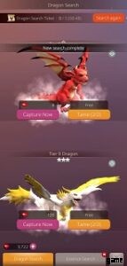 ドラゴンを検索するには、ドラゴン検索チケットが必要です。メニューに移動し、検索を選択します。次の画面では、飼いならすことができる 2 つのドラゴンが表示されます。これは、マージせずに高ティアのドラゴンを入手する最も簡単な方法です。しかし、落とし穴があります – テイムが失敗する可能性があります.再検索ボタンをタップすると、ドラゴン検索チケットと召喚チケットを使用できます。赤い宝石を使用してドラゴンを即座に捕獲します。無料の方法を使用すると、テイムに失敗する可能性があります。