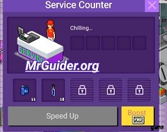 <強い> 1.) 基本 – お客様は、まずサービスカウンターに行き、希望の料理を受け取ります。目的の食品が入手できない場合は、怒っている絵文字が表示されます。お客様をタップして、お気に入りの商品をチェックしてください。品物があれば、サービスカウンターの店員さんが料理を作ってくれます。スピードアップボタンをタップすると、準備をスピードアップできます(サービスカウンターをタップ -> スピードアップ)。食品を受け取った後、顧客はあなたに現金/お金を支払い、レストランの座席/ダイニング エリアに入ります。