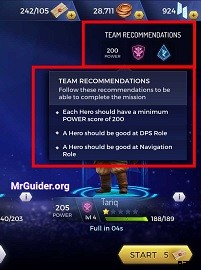 ミッションを開始する前に、ミッション準備画面に記載されているチームの推奨事項を確認してください。このミッションに適したヒーローの役割と、ミッションをクリアするために必要なパワーが表示されます。これらすべての推奨事項に注意を払い、チームで適切なヒーローを選択してください。